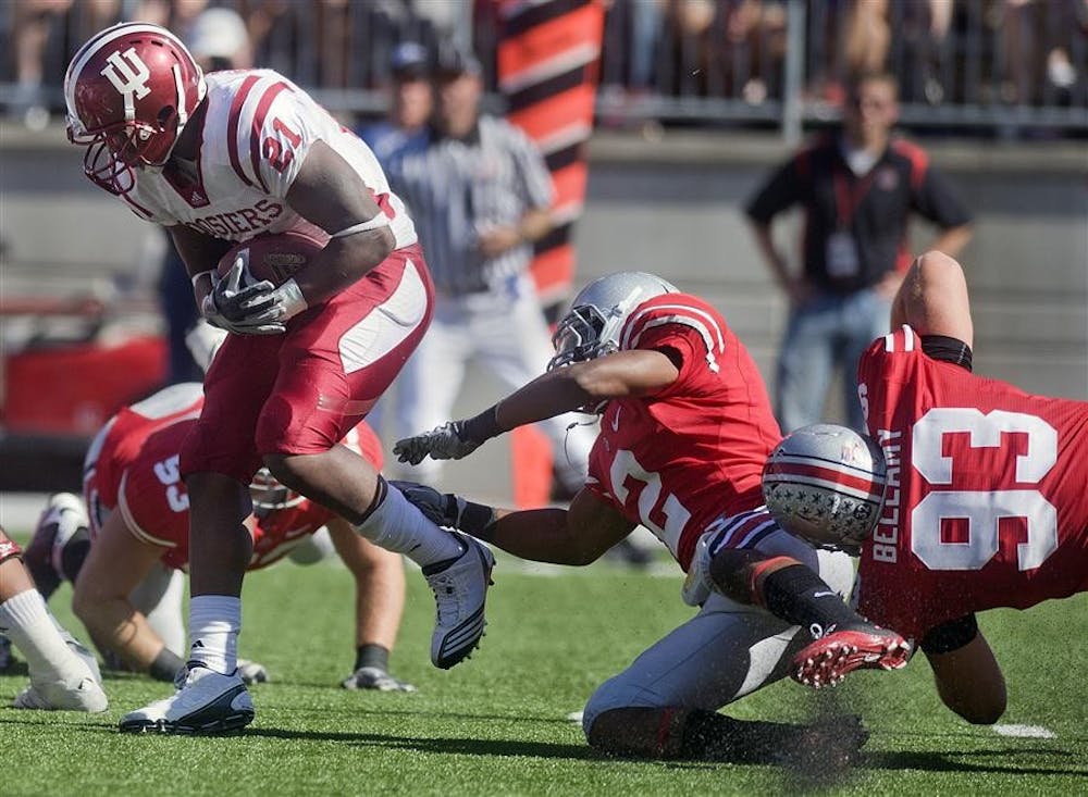Senior running back Trea Burgess accelerates past Ohio State's Adam Bellamy and Christian Bryant during IU's 38-10 loss to the Buckeyes on Saturday in Columbus, Ohio. Peter Stevenson