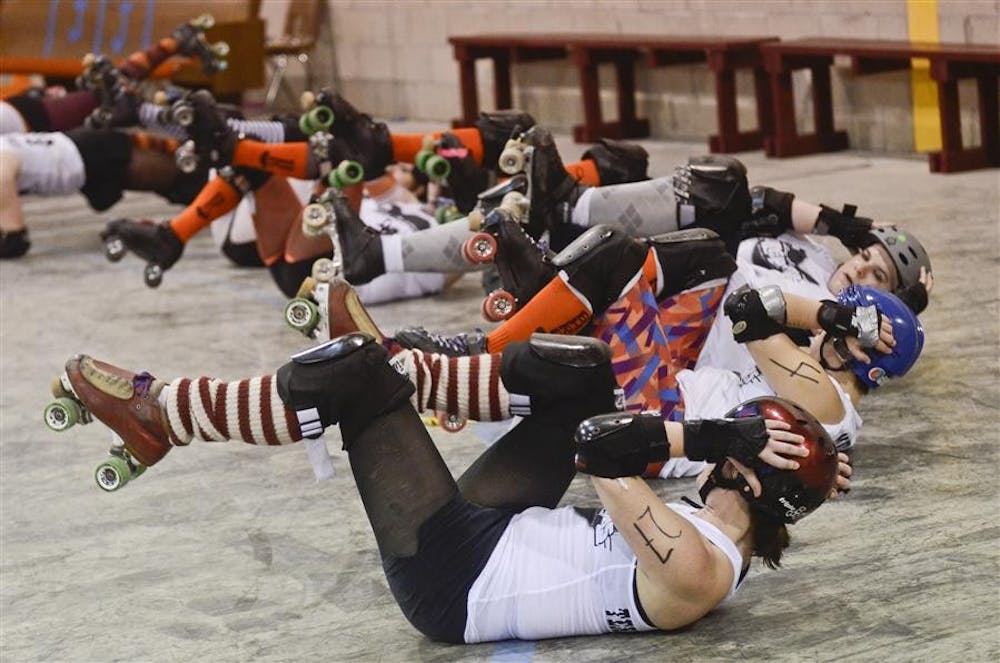 Members of the Bleeding Heartland Rollergirls lay on their backs doing warm ups prior to their scrimmage during media day Sunday at their warehouse on N. Curry Pike.