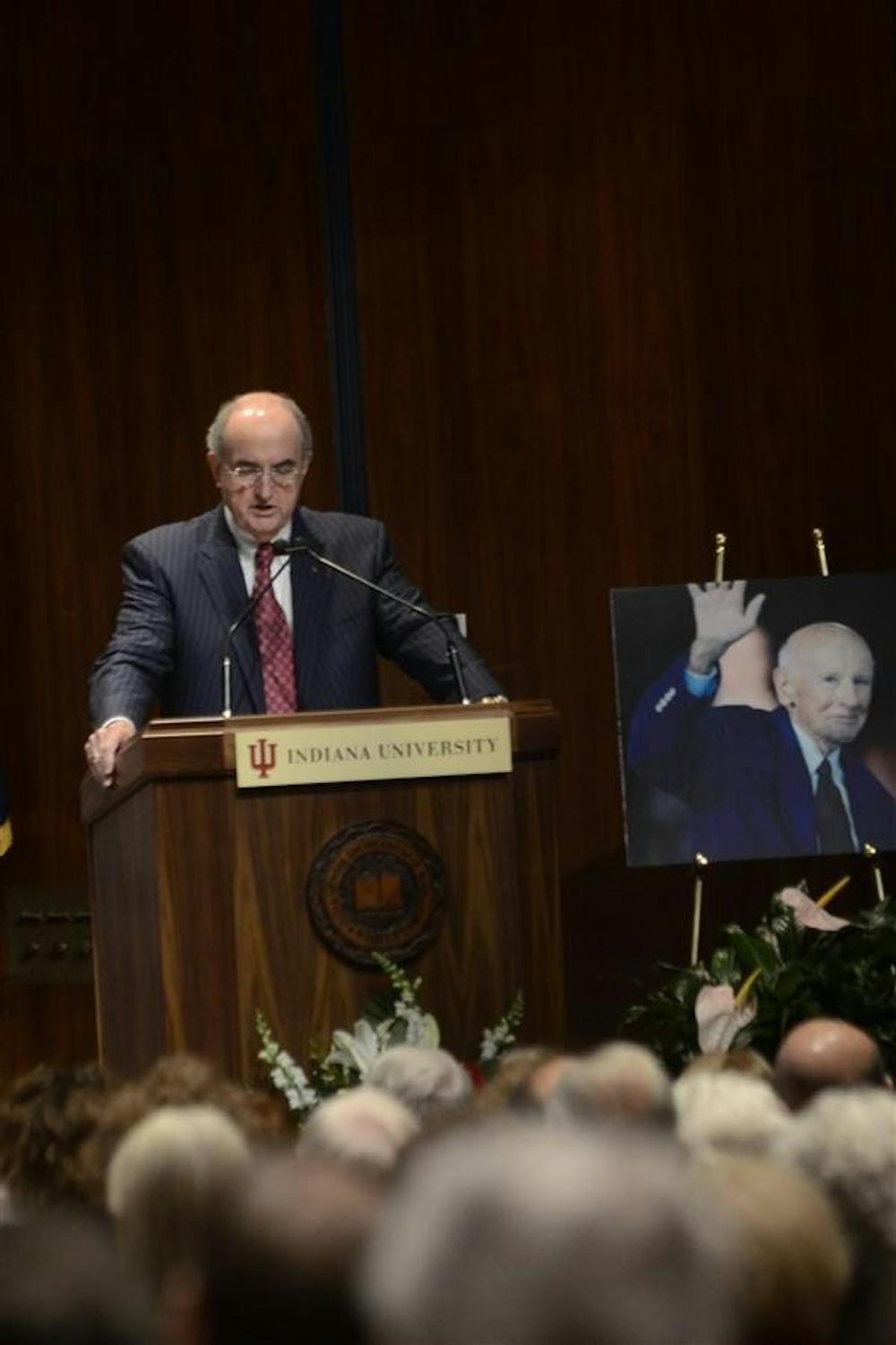 IU president Micheal A. McRobbie speaks during a memorial service for the late IU president John Ryan Friday at the Whittenberger Auditorium. Ryan was the president of IU for sixteen years. Steph Langan