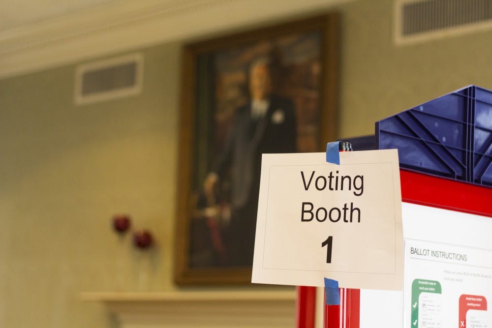 A sign hangs on a voting booth Tuesday, May 8, inside the Indiana Memorial Union.