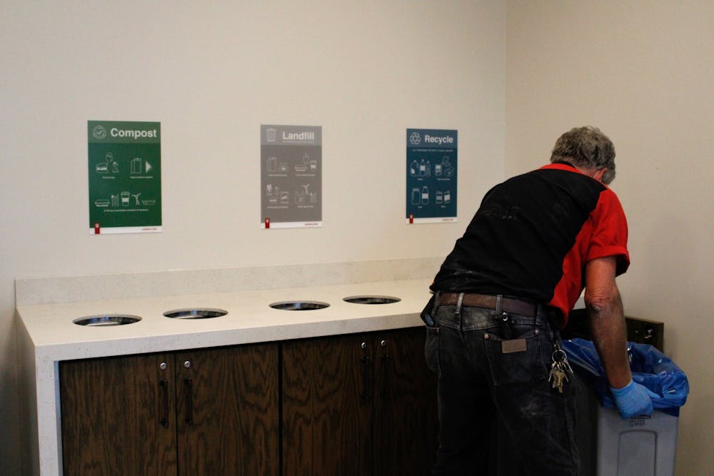 IU facility services worker John Zink replaces the recycling bin Sept. 24, 2021, inside the Indiana Memorial Union dining hall. The signs on the wall instruct students how to separate and throw away the waste from their meal.