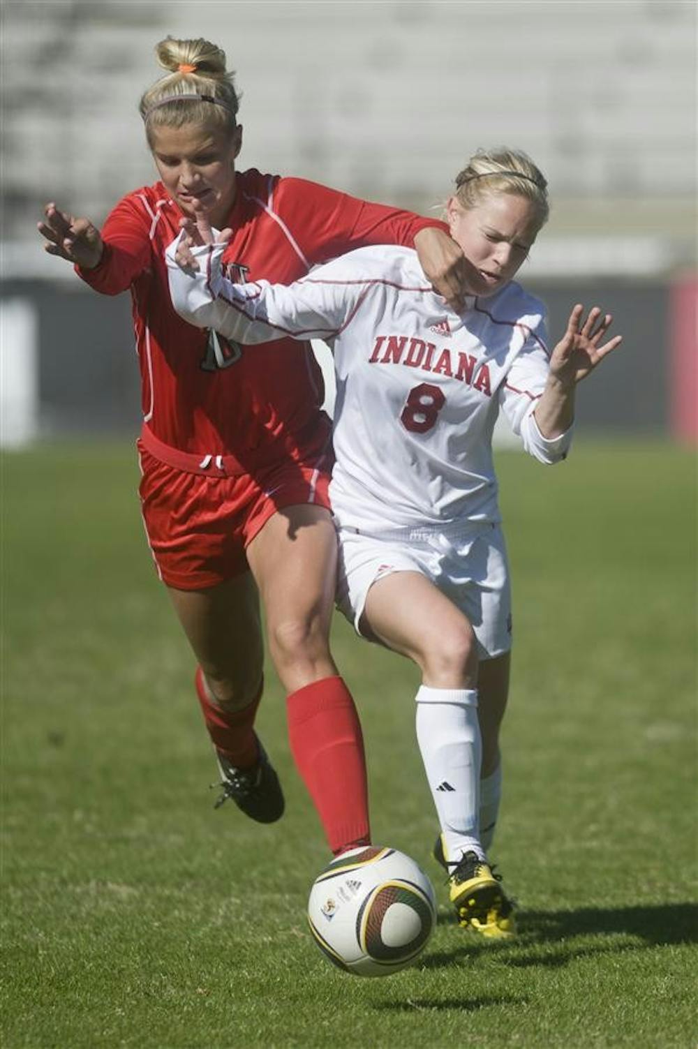 Junior midfielder Kirsta Kellin is fouled by Ohio State's Paige Maxwell during IU's 1-0 win against the Buckeyes on Sunday at Bill Armstrong Stadium. Peter Stevenson