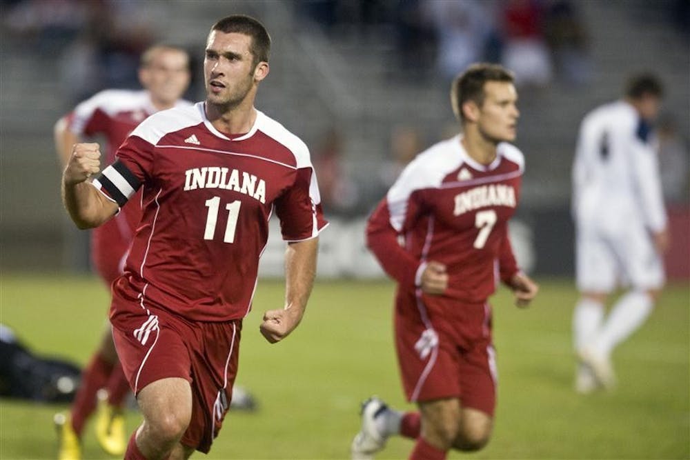 Senior forward Will Bruin celebrates his goal during IU's 2-1 loss to Notre Dame on Wednesday at Bill Armstrong Stadium. Peter Stevenson