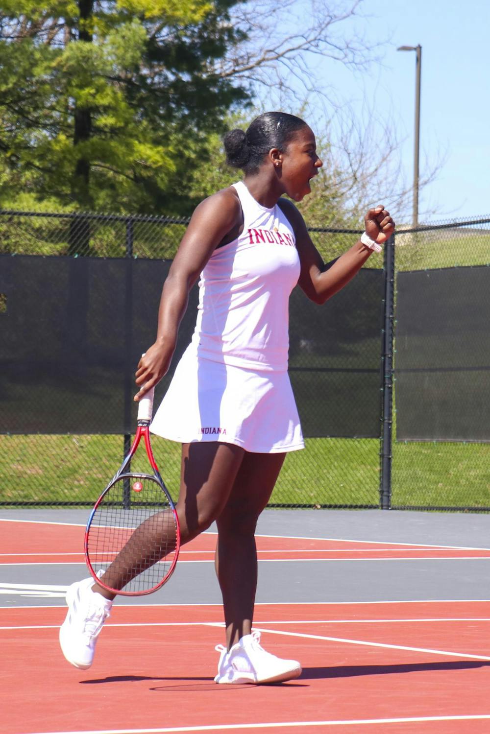 Junior Elisabeth Dunac celebrates after a point during the match against Nebraska on March 29, 2026, outside of the IU Tennis Center in Bloomington. Dunac's singles match went 7-6, 4-6 before it was left unfinished.