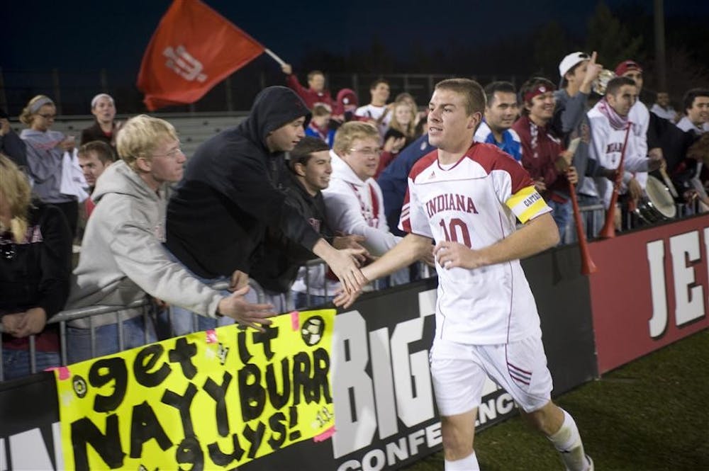 Senior midfielder Andy Adlard celebrates with students in "The Cage," IU's student section, after winning the Big Ten Championship on Sunday at Bill Armstrong Stadium.
