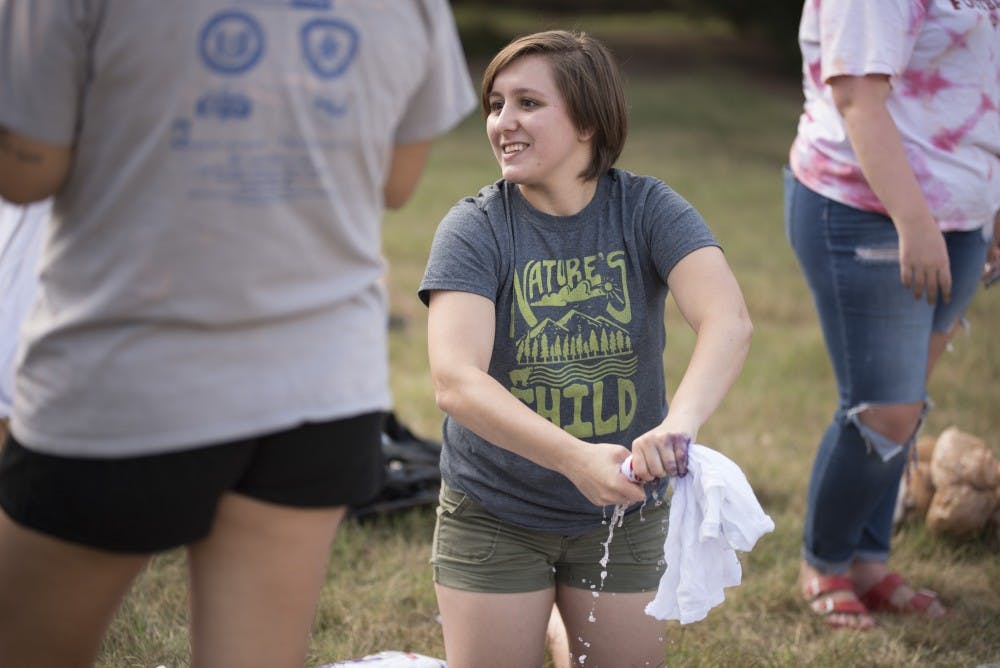 Junior Melanie Yoder puts an "IU is Home" t-shirt in water before she tie-dyes it. The IU Feminist Student Association Tie-Dye Panty Party collected feminine products at their event on Saturday in the Arboretum. Rose Bythrow