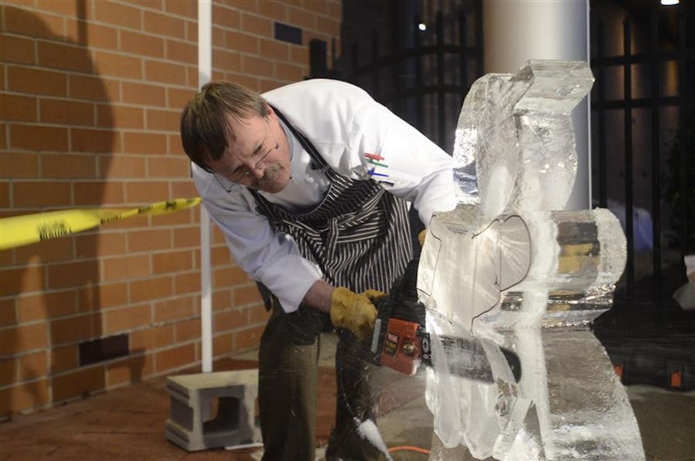 Artist Herman Serfling uses a chainsaw to scuplt a figure out of ice Friday outside Wonderlab Museum of Health, Science and Technology. Children plugged their ears from the noise as they watched Serfling work. Steph Langan
