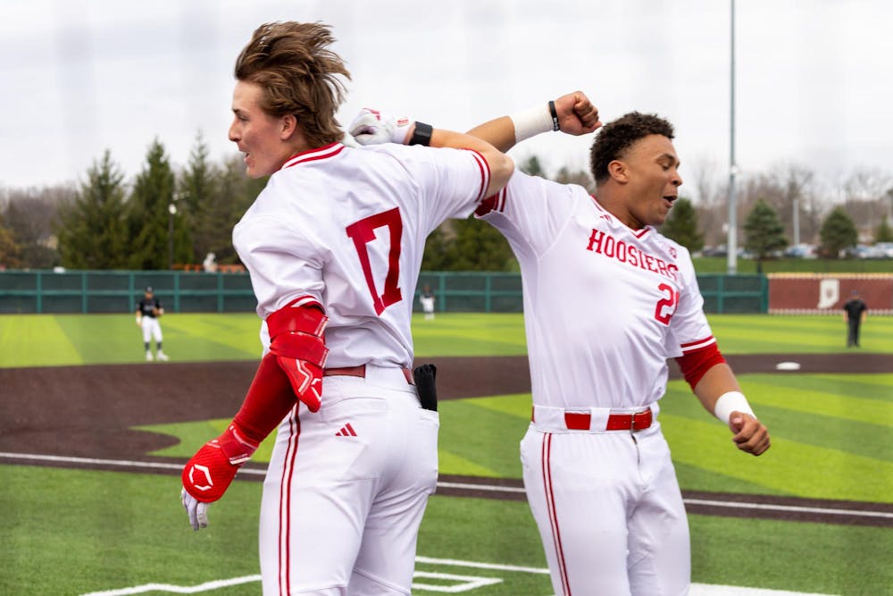 Sophomore left-handed pitcher and outfielder Caleb Koskie (left) and freshman catcher Owen ten Oever (right) celebrate a run during the game against Wright State University on March 10, 2026, at Bart Kaufman Field in Bloomington. The Hoosiers won 12-4.