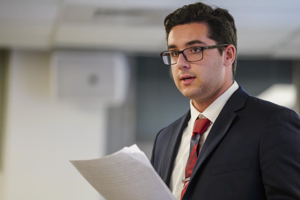 Nathan Mirsky of IU College Republicans opens the IU College Republicans and Democrats debate Oct. 24 in Lindley Hall. The two groups debated the Tel Aviv U.S. Embassy’s move to Jerusalem, immigration and the Tax Cuts and Jobs Act.