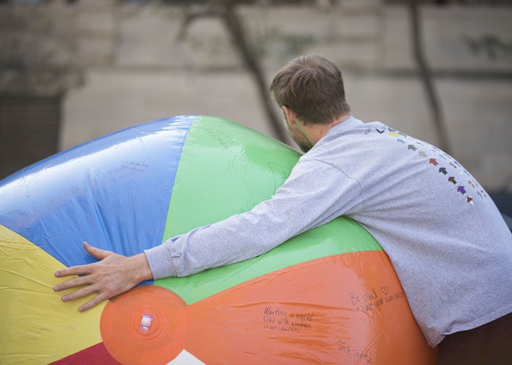 Joe Krahulik, senior, hugs the free speech ball outside Ballantine Thursday. Young Americans for Liberty asked people to write whatever they wanted on the giant beach ball in the spirit of free speech.