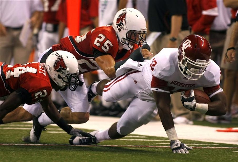Sophomore running back Stephen Houston dives for a first down Saturday at Lucas Oil Stadium in Indianapolis.