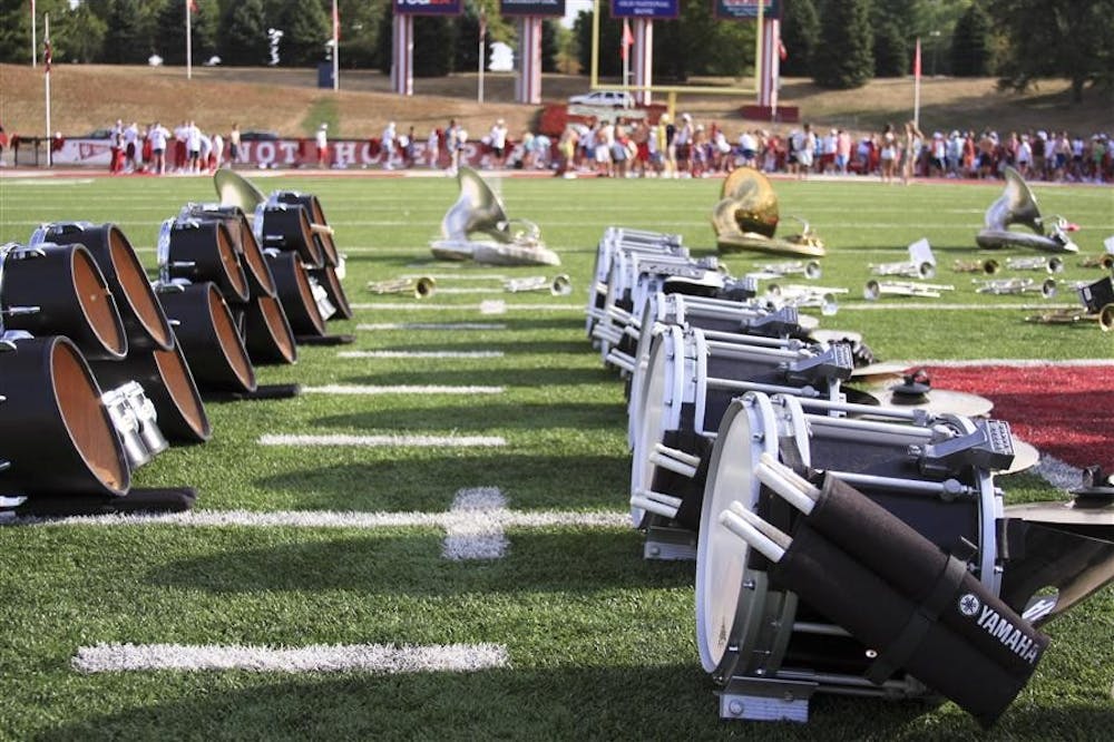 Changing into their Hawaiian attire, the Marching Hundred takes a brief break from playing their instruments.