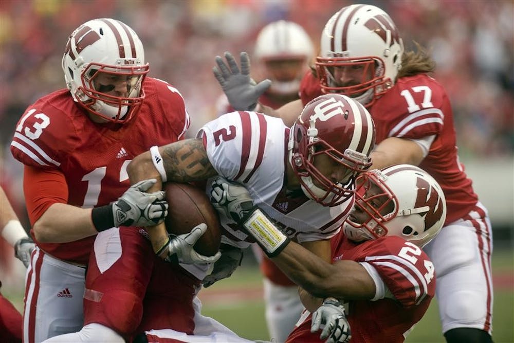 Junior wide receiver Tandon Doss is brought down by Wisconsin defenders during IU's 83-20 loss to the Badgers on Saturday in Madison, Wis. Peter Stevenson