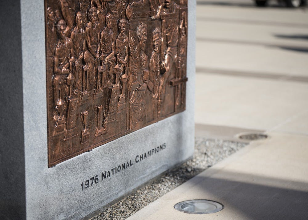 The 1976 IU baskeball national championship monument was installed in front of Simon Skjodt Assembly Hall. This was Bob Knight's first national championship win.