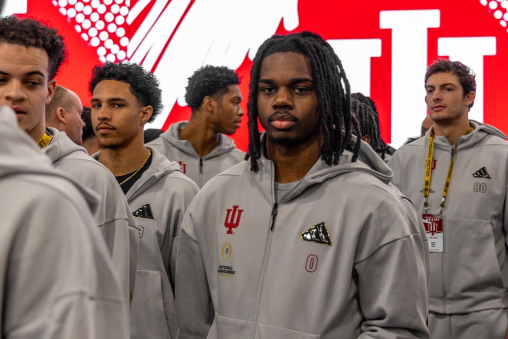 Indiana football players arrive to media availability Jan. 17, 2026 at the Miami Beach Convention Center in Miami Beach, Florida. The Hoosiers began answering questions around 10:20 a.m.