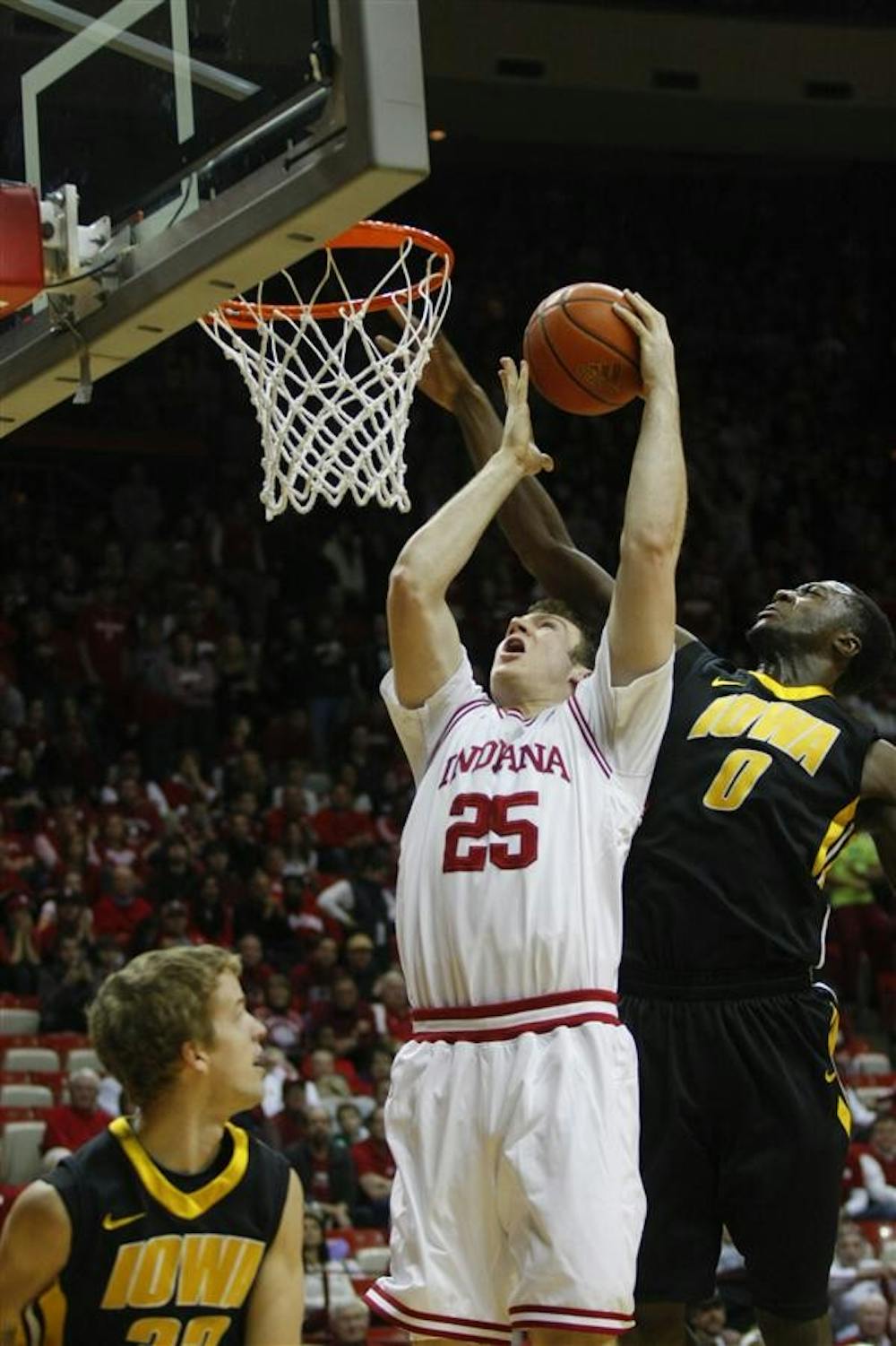Senior forward Tom Pritchard tries to put back a rebound during IU's 103-89 win against Iowa on Jan. 29 at Assembly Hall. Mark Felix
