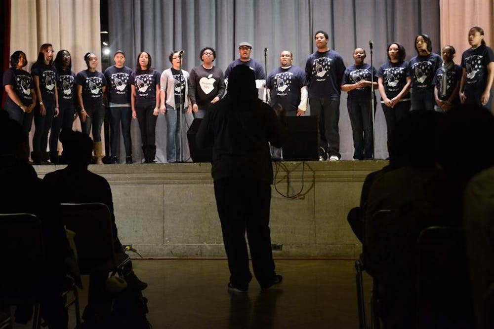 IU gospel choir Voices of Hope sings "Oh what a Mighty God we Serve" during Expressions of Dr. King's Dream: A Legacy of Arts Thursday in Alumni Hall. This was the first time that this event was held and there are plans of making it a permanent event as a part of yearly MLK celebrations. There was standing room only in Alumni Hall during the festivities.