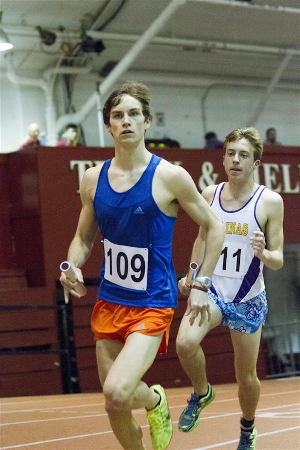 Aaron Zollman (109) of Blue Steel and Connor Williams of Mercury compete in Little Fifty qualifications Thursday evening at the Harry Gladstein Fieldhouse. Mercury won qualifications, in a time of 8:47, while Blue Steel placed 4th in 8:57.
