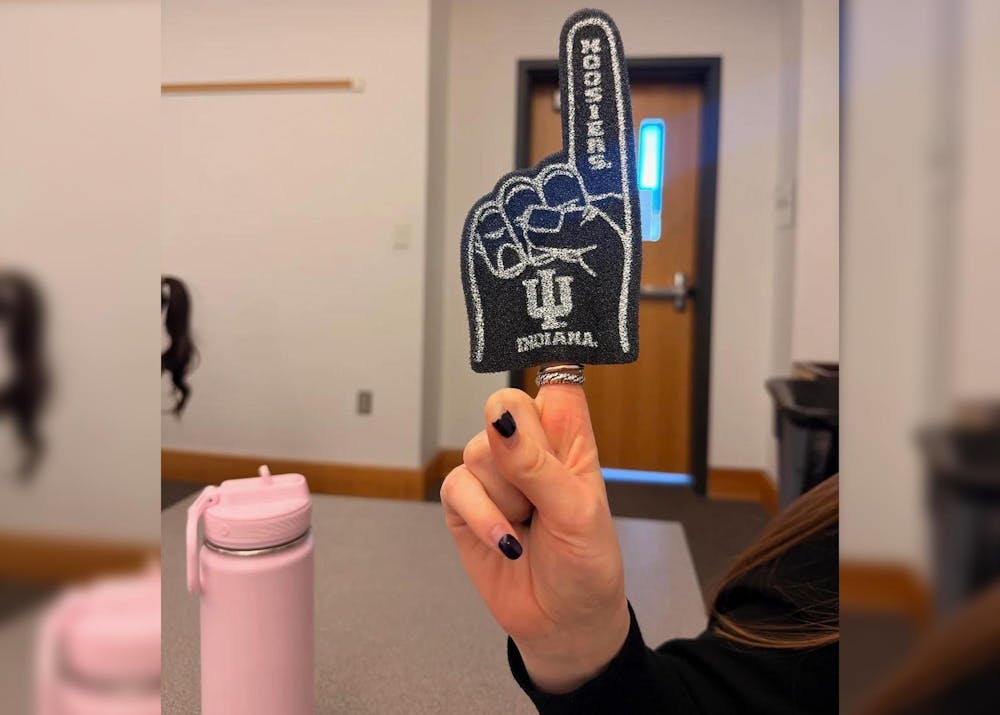 Jordan Young holds up a miniature Indiana University foam finger during an IU Kelley School of Business class Feb. 25, 2026. The foam finger was the starting item in a trading chain that got over 140,000 views on Reddit and X. Courtesy Photo