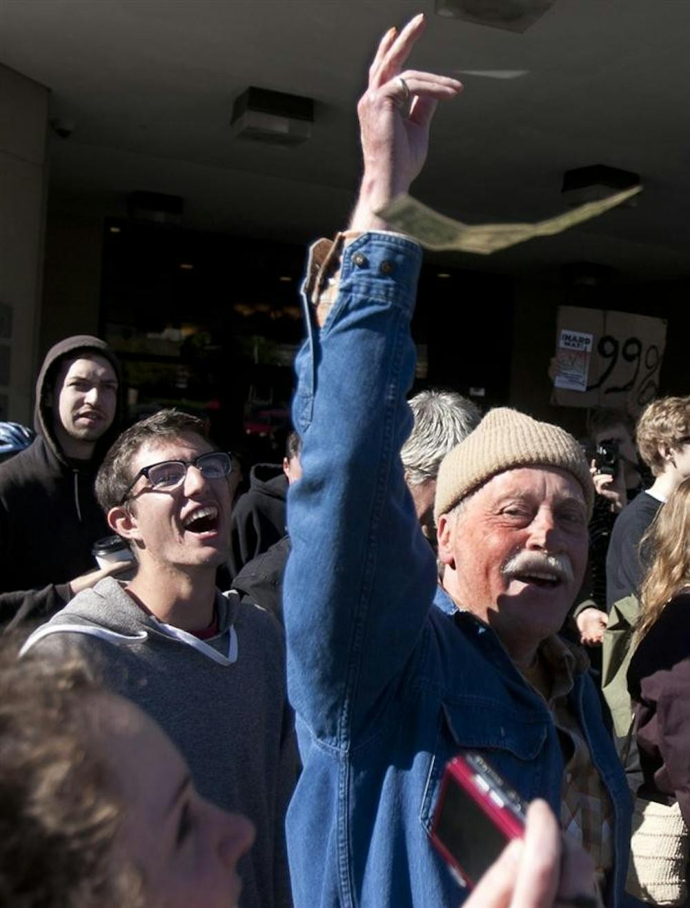An Occupy Bloomington participant throws one dollar bills outside of Chase Bank Saturday in downtown Bloomington. Mark Felix
