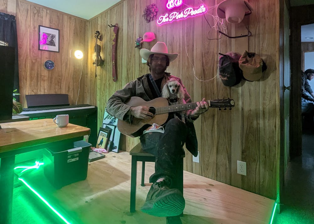 Danny Weddle and Zuul the Gatekeeper pose for a photo Feb. 22, 2026, at the Pink Poodle West outside Lockhart, Texas. Weddle constructed a stage soon after arriving in Texas.