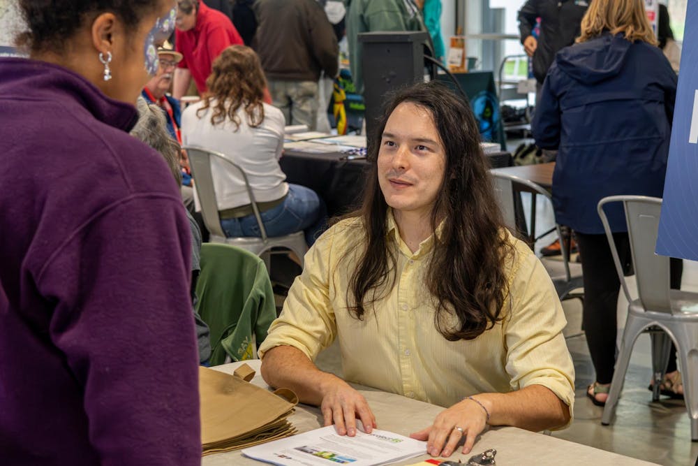 A vendor talks to an attendee at the Earth Day event April 18, 2026, at Switchyard Park in Bloomington. The event was free and open to the public, with each vendor promoting different methods of being environmentally friendly.