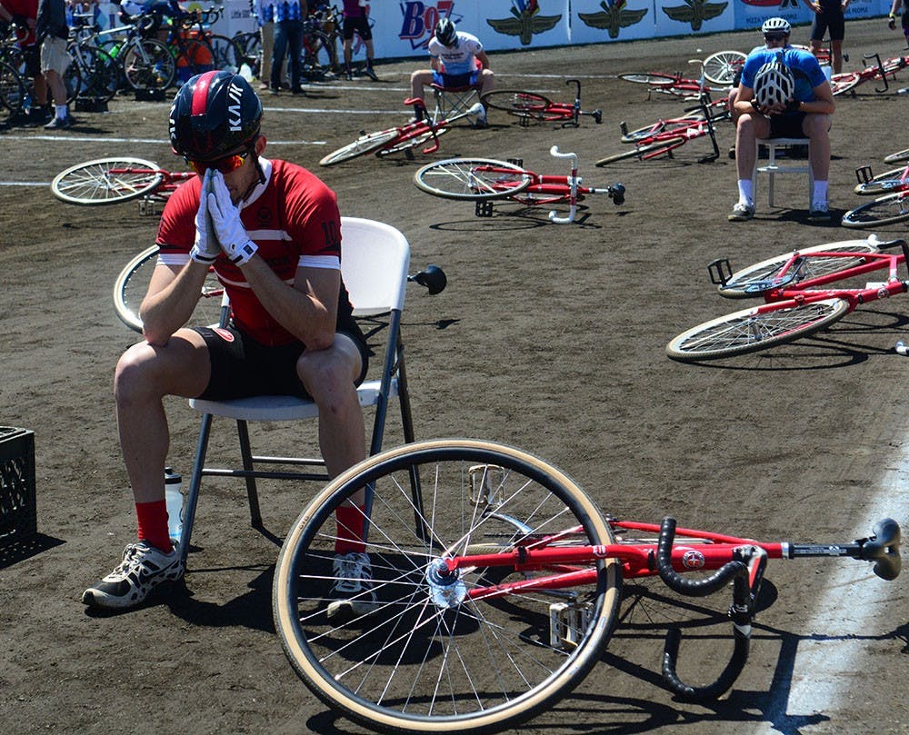 Luke Momper, rider of Delta Tau Delta, bows his head during a minute of silence for Hannah Wilson before the Little 500 men's race starts Sunday at Bill Armstrong Stadium.