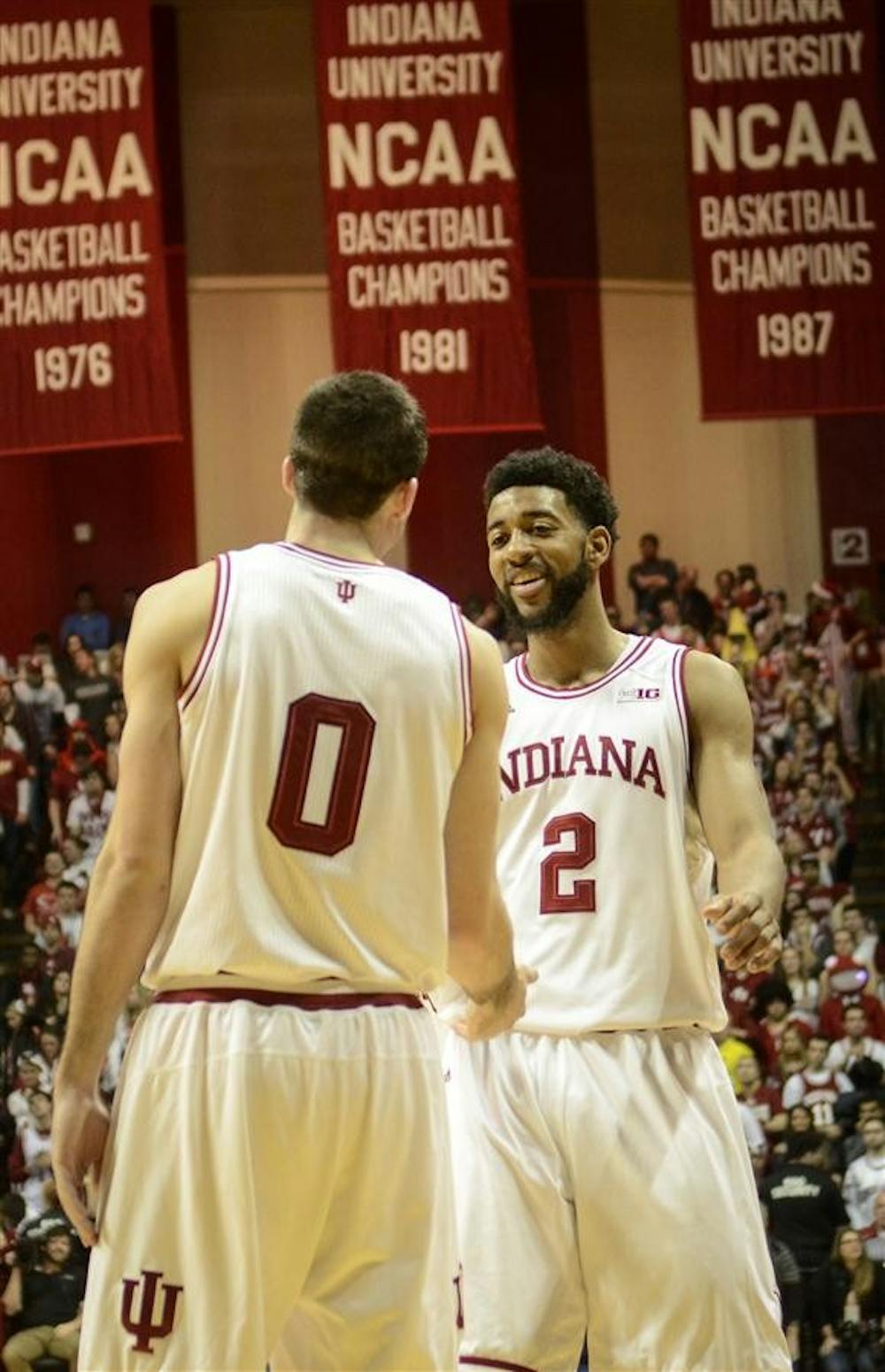 Junior forward Will Sheehey and senior forward Christian Watford talk with one another during the Hoosiers' 81-73 win against Michigan on Saturday at Assembly Hall. Steph Langan