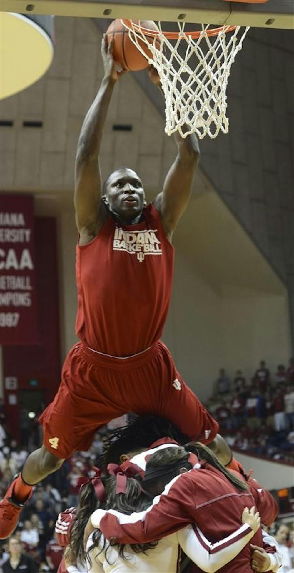 During the dunk contest Victor Oladipo succesfully dunks the ball over a group of people during Hoosier Hysteria. Steph Langan