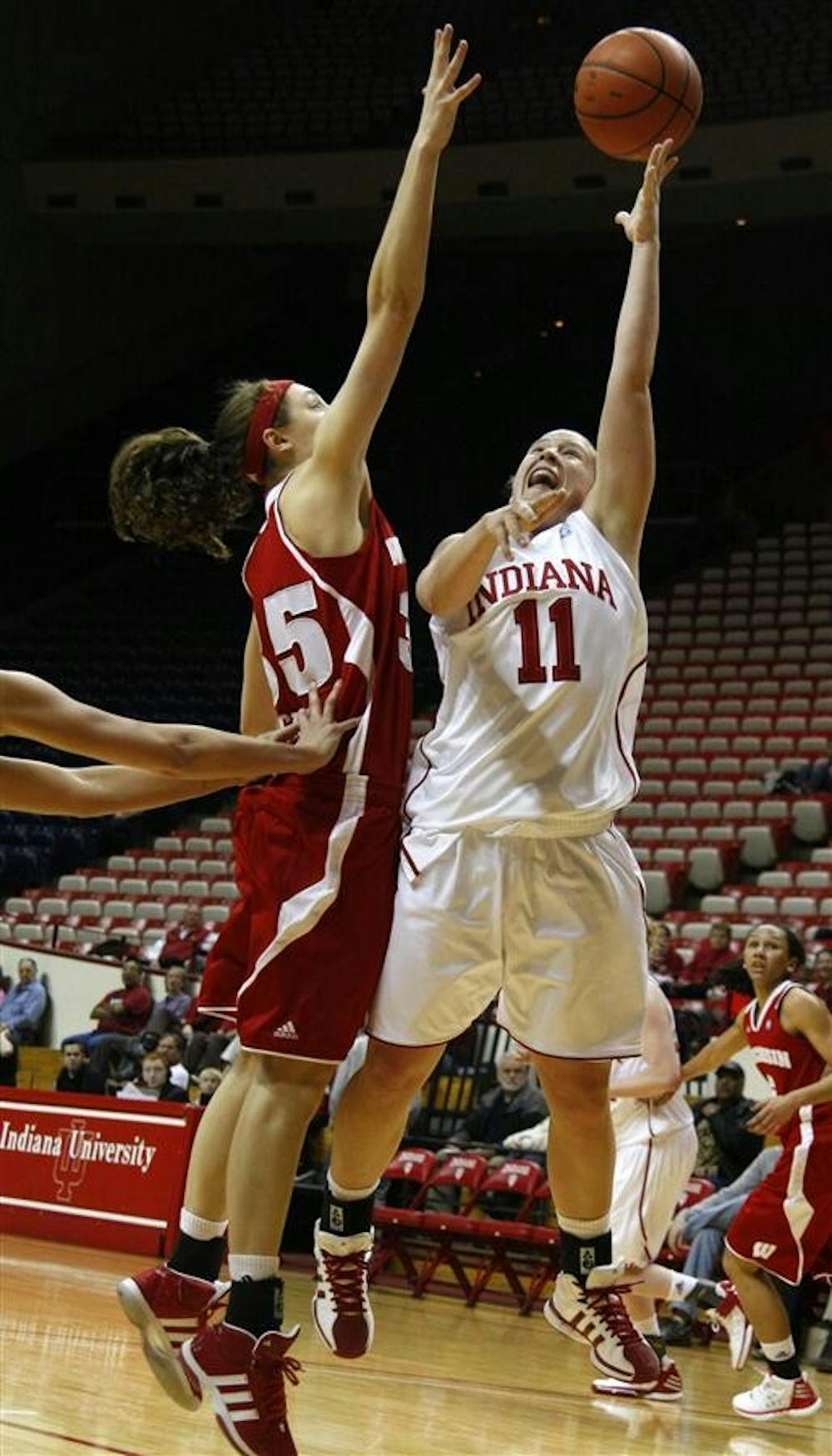 Sophomore guard Andrea Newbauer tries to put up a shot against a Wisconsin defender during IU's 62-60 win against Wisconsin on Thursday at Assembly Hall