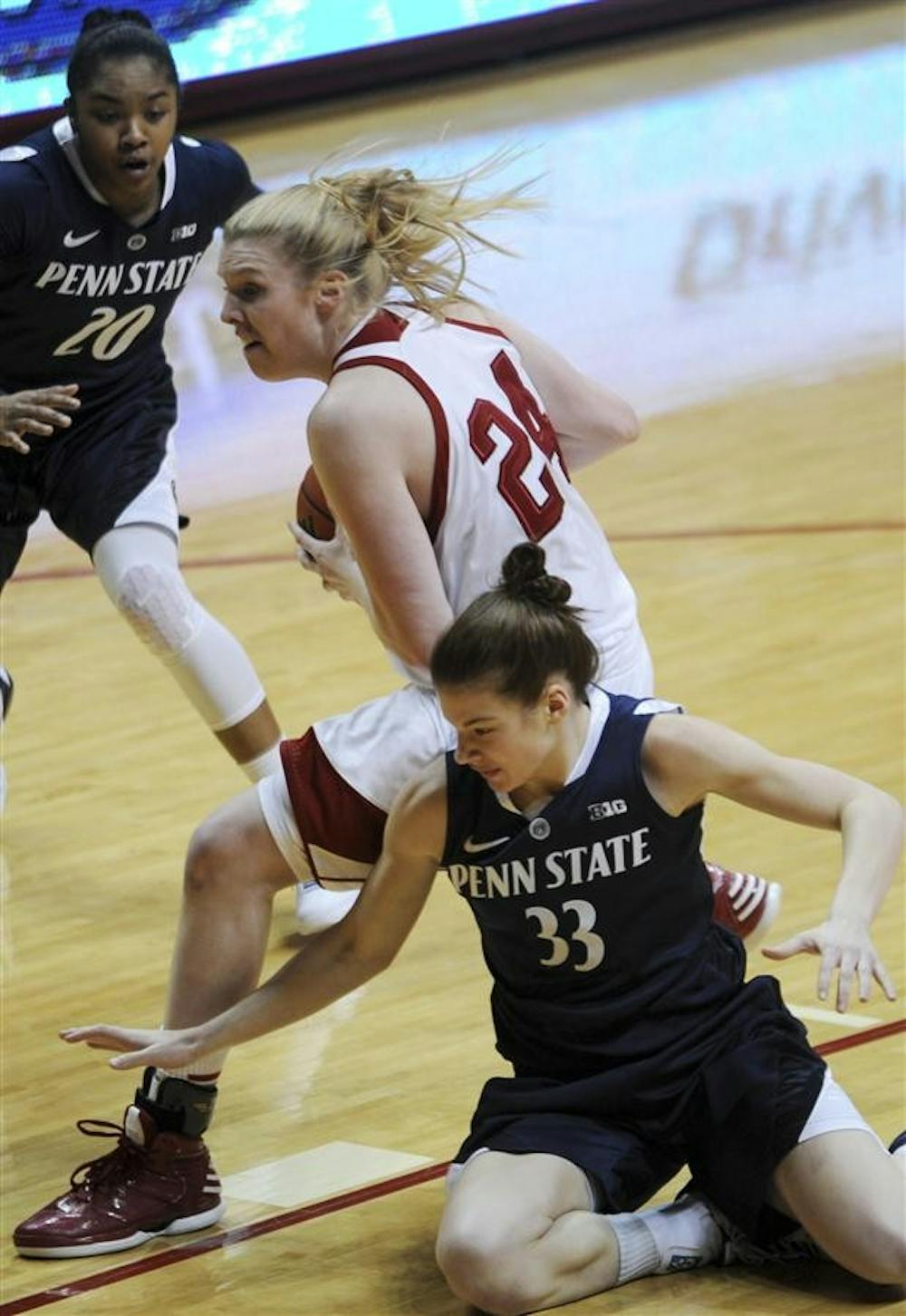 Senior forward Aulani Sinclair drives past defenders in a game against Penn State on Thursday at Assembly Hall. Hoosiers lost 76-54. Mark Felix