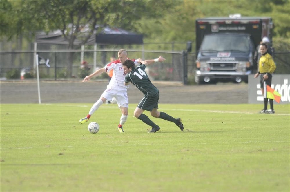Senior midfielder Alec Purdie fights for the ball during the Hoosiers' 2-2 tie against Michigan State on Oct 23 at Jerry Yeagley Field.