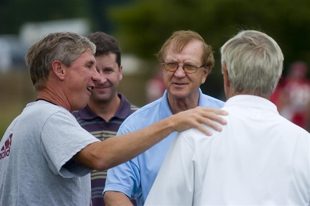 IU coach Bill Lynch (left) shares a moment on the sidelines with legendary former IU soccer coach Jerry Yeagley (center right) and others during football practice Aug. 25 at the IU football practice field. Peter Stevenson