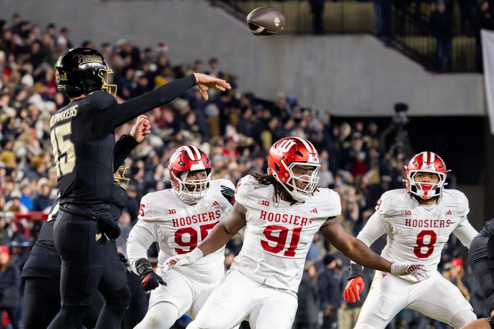 Redshirt junior defensive lineman Tyrique Tucker, sixth-year senior defensive lineman Dominique Ratcliff and senior defensive lineman Stephen Daley (left to right) watch the ball during a play Nov. 28, 2025, at Ross-Ade Stadium in West Lafayette, Indiana. Daley had five solo tackles in the game.