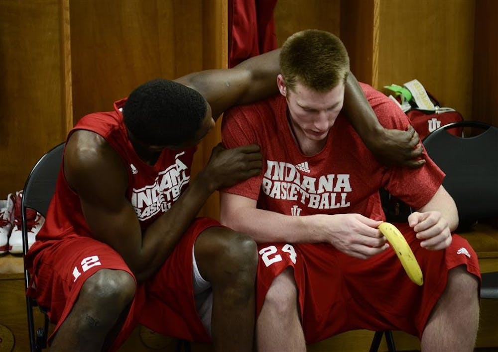 Freshman Hanner Mosquera-Parea talks with junior Jeff Howard in the team locker room during a press conference on Saturday at the University of Dayton Arena. Steph Langan