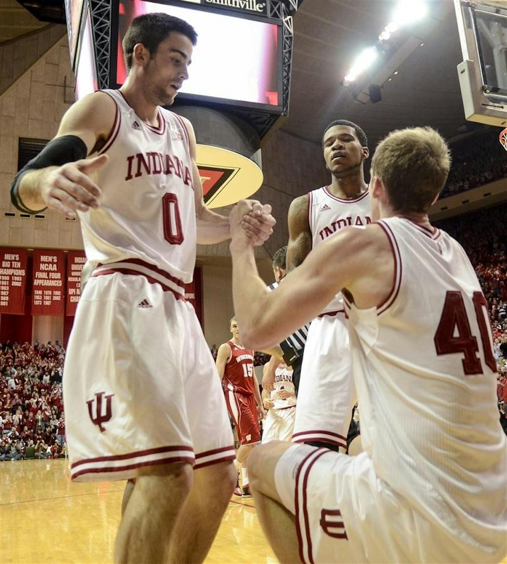 Junior forward Will Sheehey helps up sophomore forward Cody Zeller during the Hoosiers' 64-59 loss to Wisconsin on Tuesday at Assembly Hall.