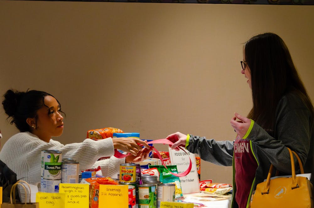 (Left) Service chair Maya Judy hands raffle tickets to an attendee of the Miss Indiana University Scholarship Competition on Feb. 15, 2026, in the Willkie Auditorium in Bloomington. The proceeds from the raffle went to Crimson Cupboard Food Pantry.