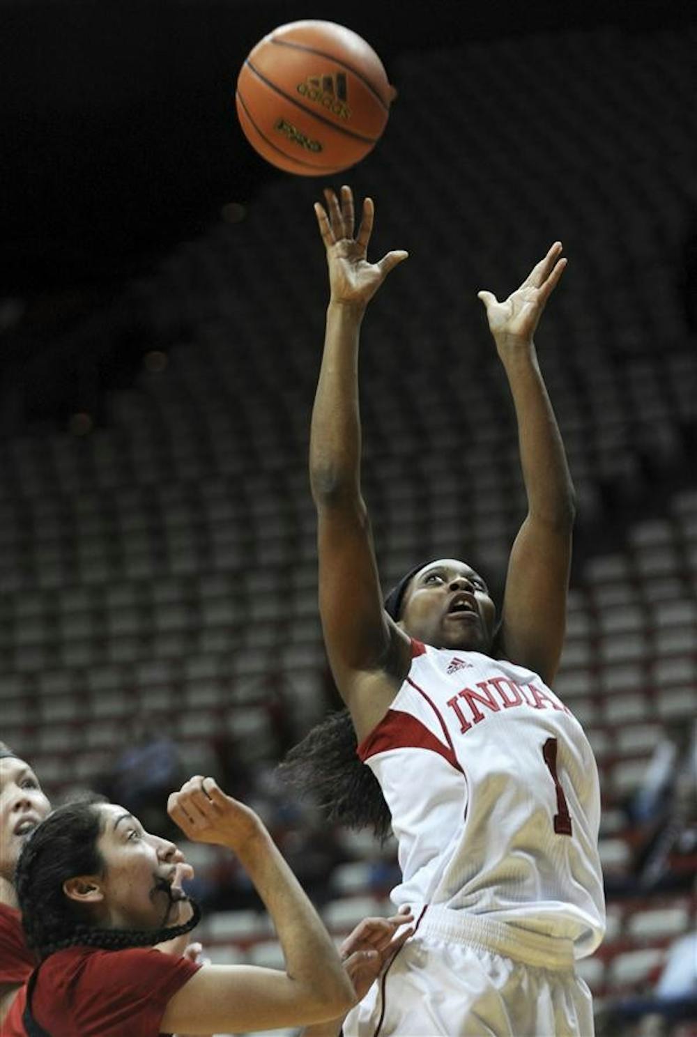Senior guard Jasmine McGhee tries to shoot a floater over a defender against Nebraska Thursday at Assembly Hall. The Hoosiers lost 67-38. Mark Felix