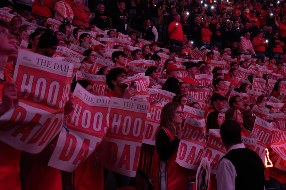 Illinois fans hold up copies of The Daily Illini that read "Hoosier Daddy," before the game against Indiana on Feb. 15, 2026, at the State Farm Center in Champaign, Illinois. As the clock ran down at the end of the game, Illinois fans started chanting "Hoosier daddy."