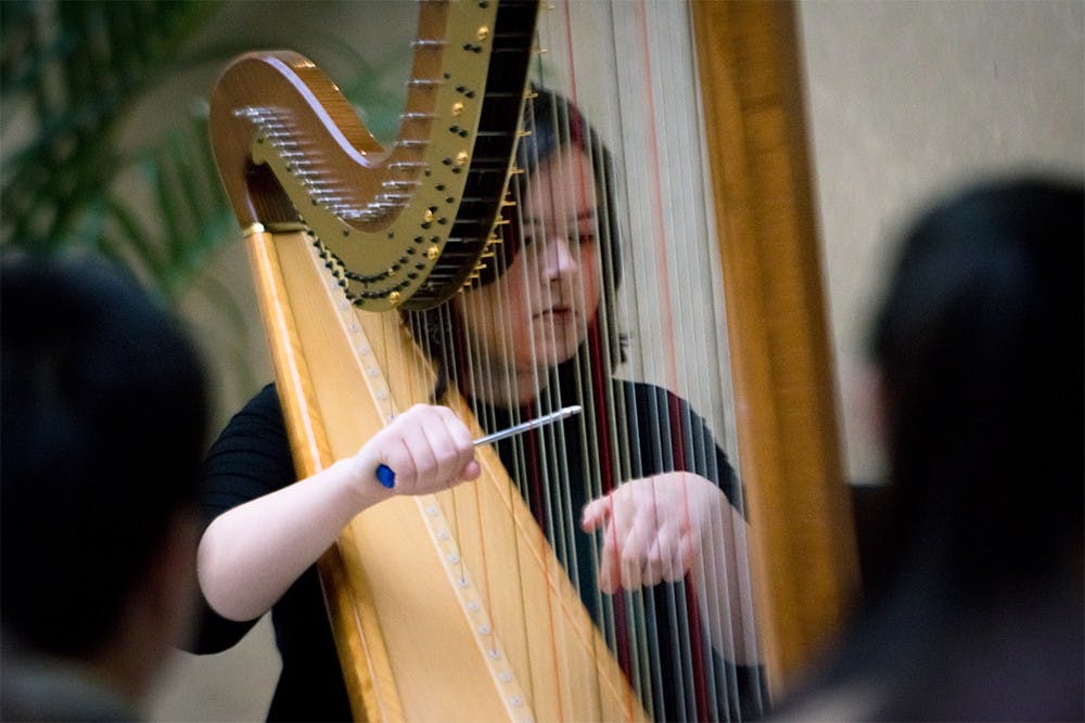 Harpist Alexandra Mullins performs "Zemeng Boat", written by Qi Li, at the East Meets West concert Sunday at the Art Museum. The concert showcased New Chinese music written for Western instruments. Levi Reece and Levi Reece