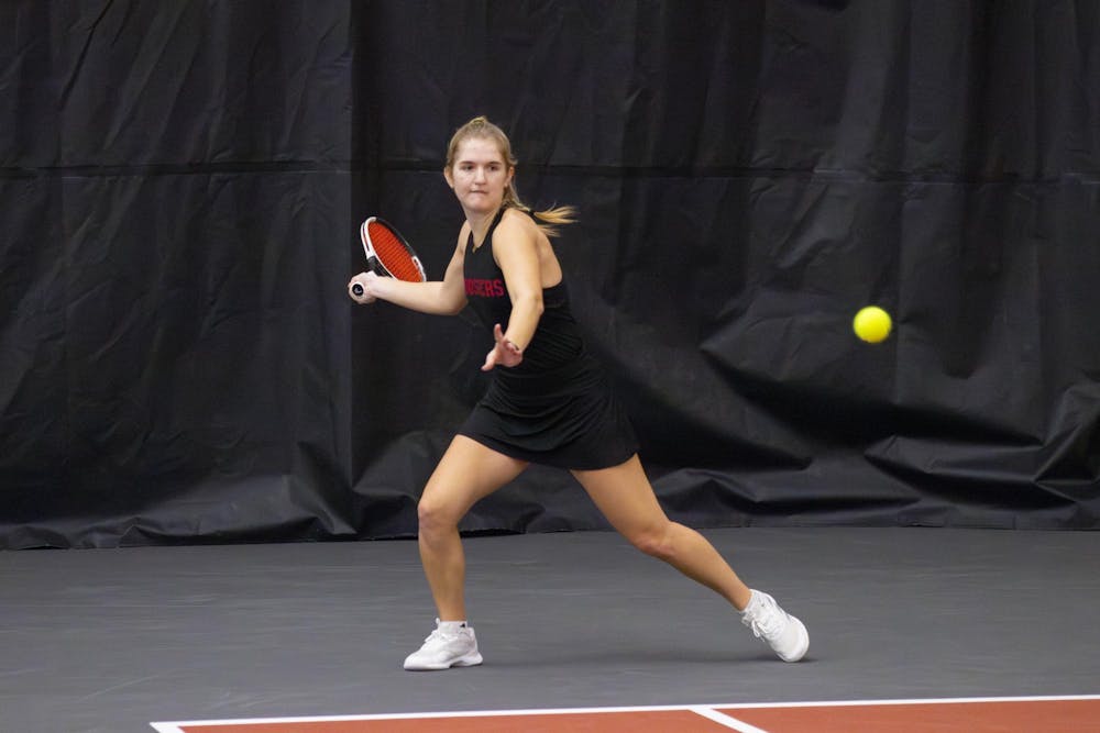 Junior Chase Boyer swings toward the ball during the match against Cornell University on Feb. 21, 2026, at the IU Tennis Center in Bloomington. Boyer won her first singles set. Jimmy Rush