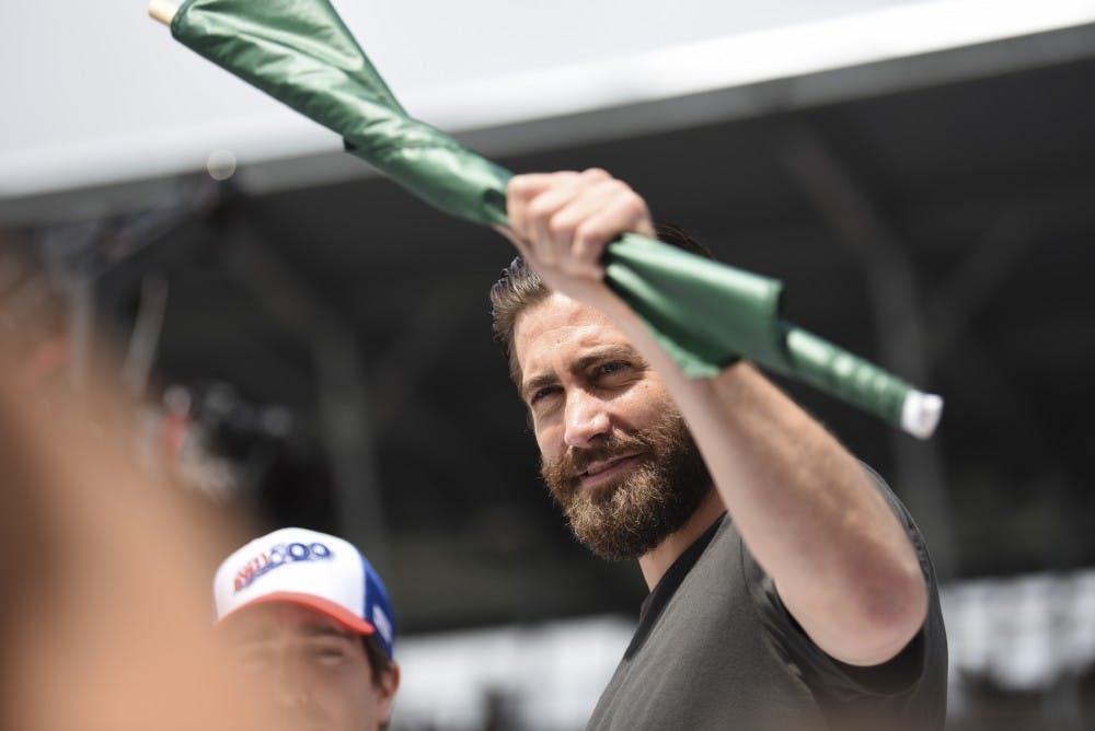 Jake Gyllenhaal holds up the green flag. Gyllenhaal was the honorary flag waver along with boston marathon survivor, Jeff Bauman.