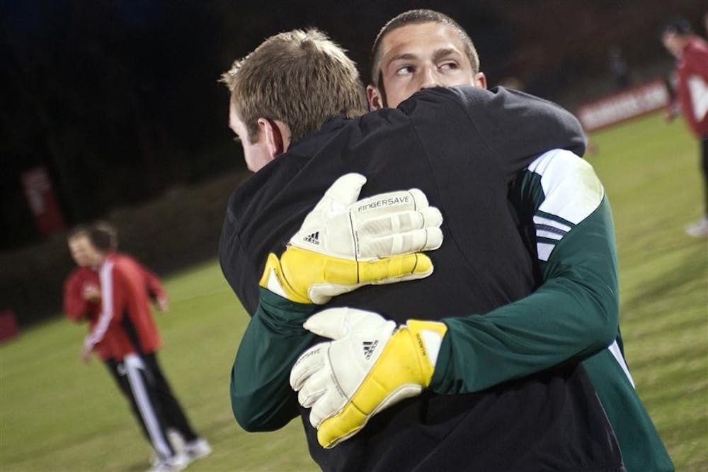 Junior goalkeeper Nate Mitchell celebrates after IU's 3-2 comeback win against Northwestern on Sunday at Bill Armstrong Stadium. Peter Stevenson