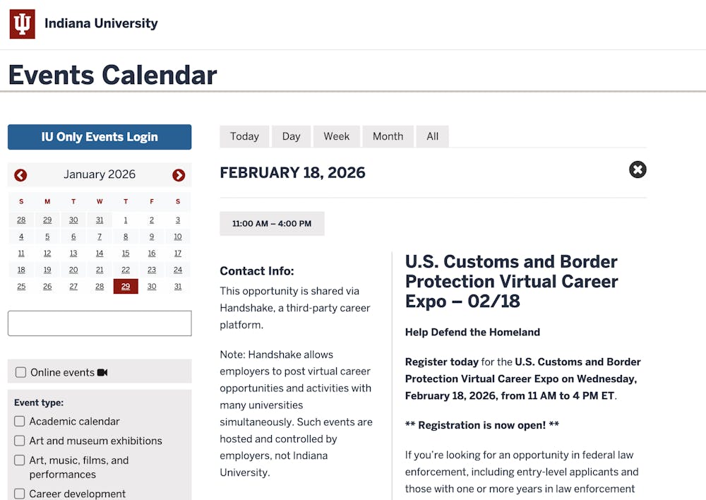 A screenshot of the event "U.S. Customs and Border Protection Virtual Career Expo" scheduled for Feb. 18 is seen listed on IU's events calendar Jan. 29, 2026. IU spokesperson Mark Bode said the virtual event was posted to Handshake.