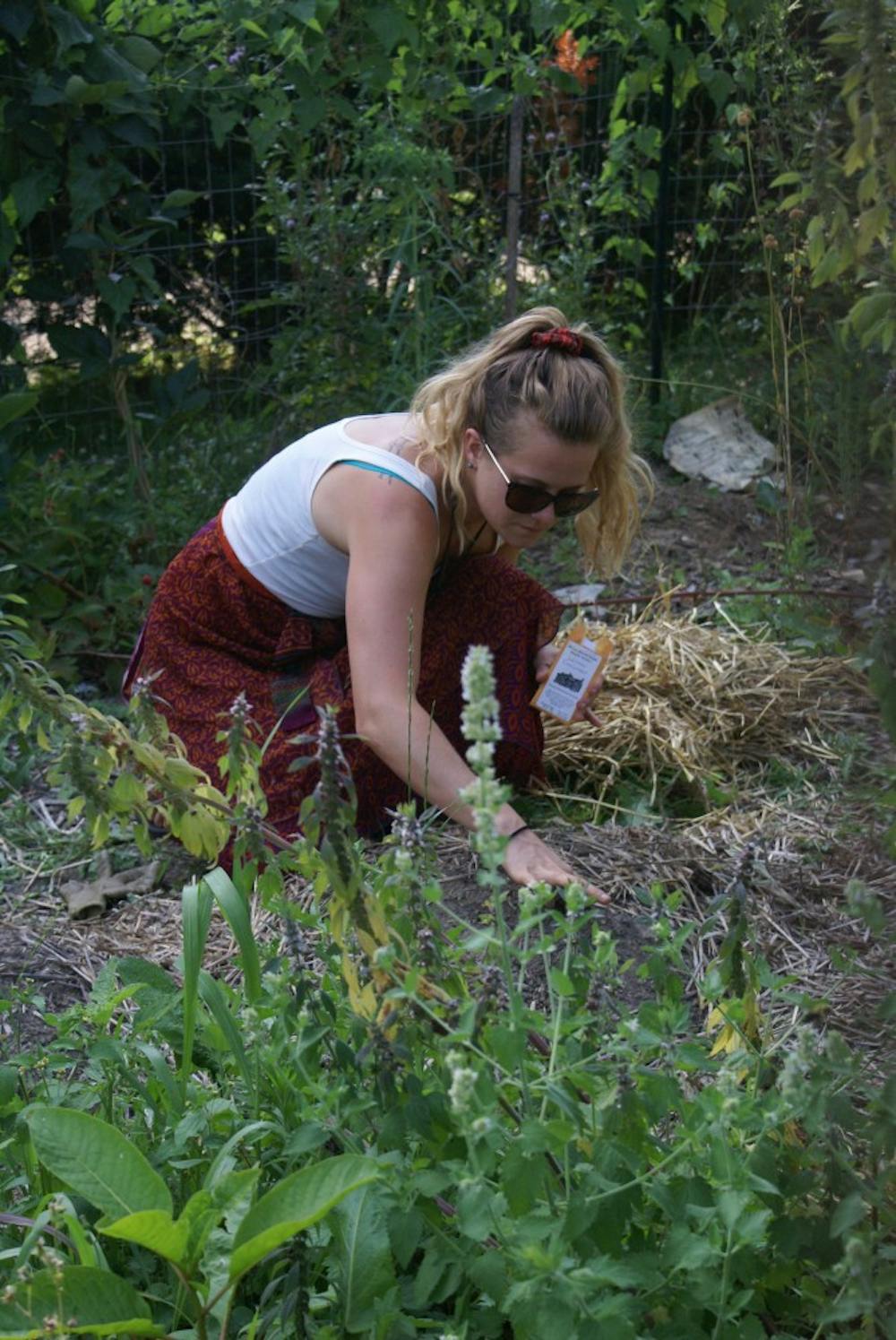 Taylor Beck plants cucumbers Wednesday evening in the Students Producing Organics Under The Sun community garden. Samantha Starr and Samantha Starr