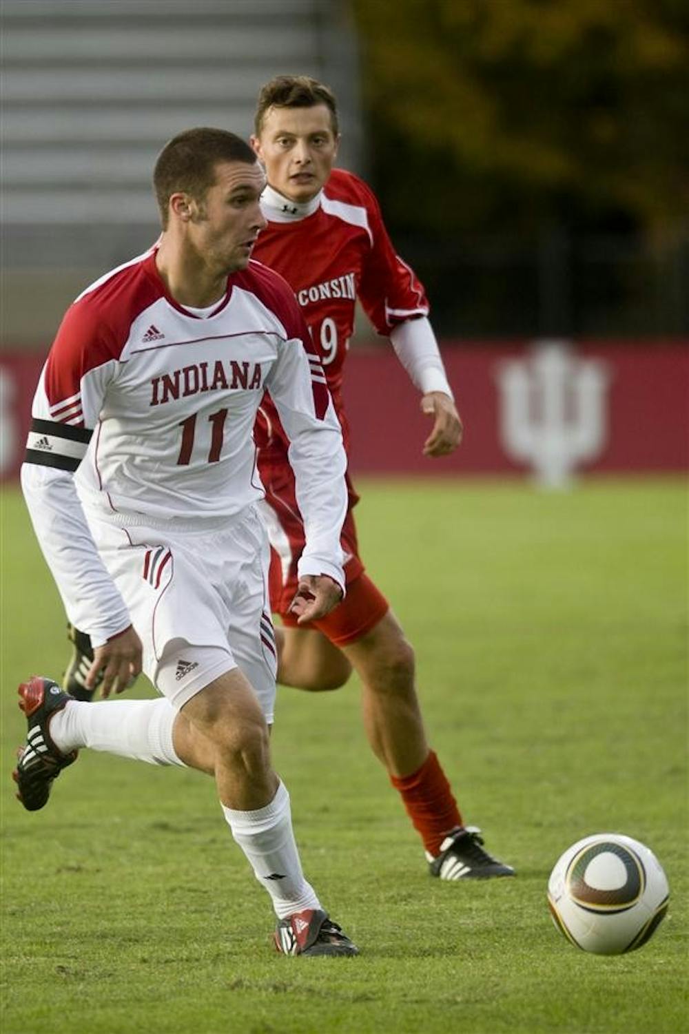 Junior forward Will Bruin dribbles towards goal during IU's 1-1 draw against Wisconsin Sunday at Bill Armstrong Stadium. Peter Stevenson