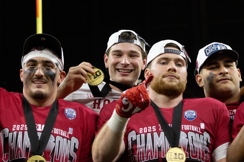 Redshirt junior linebacker Isaiah Jones (far left), redshirt junior quarterback Fernando Mendoza (left), redshirt junior linebacker Kaiden Turner (right) and sophomore defensive lineman Mario Landino (far right) celebrate after the Big Ten Championship game against Ohio State on Dec. 6, 2025, at Lucas Oil Stadium in Indianapolis. Indiana's defense held Ohio State to 58 rushing yards.