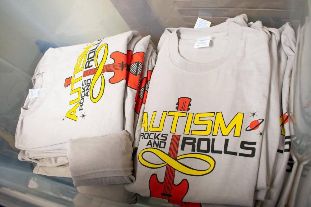 "Autism Rocks and Rolls" T-shirts sit in a plastic tube in the basement of Mitchell's home Nov. 19, 2025, in Owensburg, Indiana. The infinity symbol was included to represent the limitless possibilities that exist for those with autism.