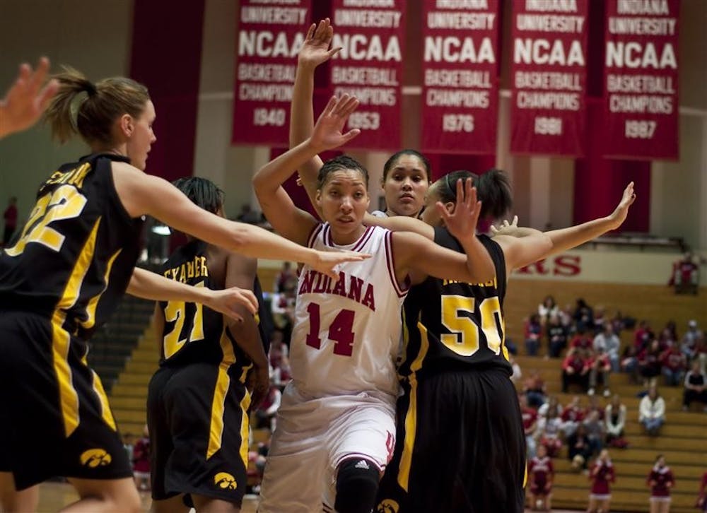 Junior forward Hope Elam tries to escape from Iowa defenders before an inbounds pass during IU's 71-67 loss to the Hawkeyes Feb. 11 at Assembly Hall. Peter Stevenson