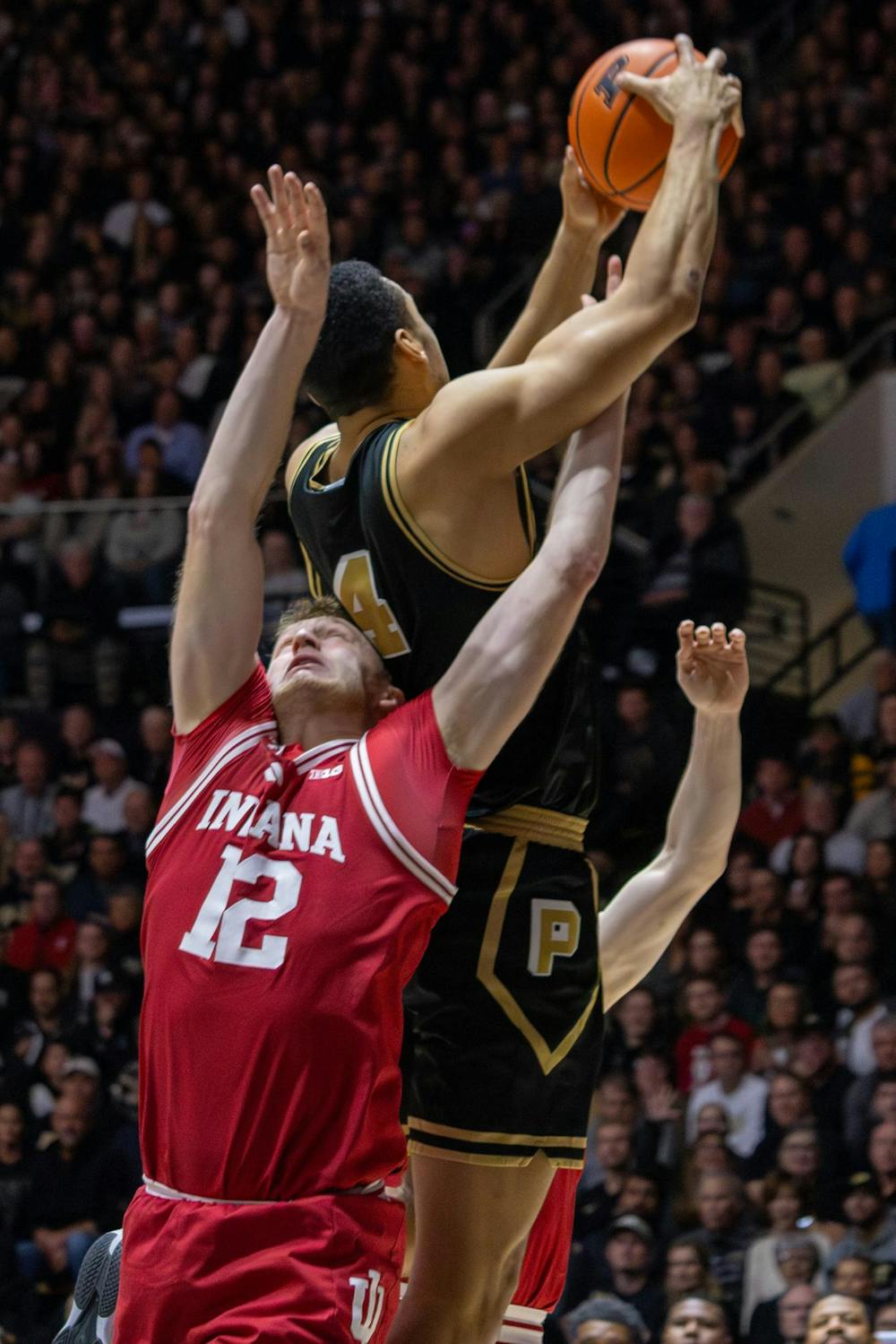 Redshirt senior forward Tucker DeVries attempts to steal the ball from sophomore guard Gicarri Harris during the game against Purdue on Feb. 20, 2026, at Mackey Arena in West Lafayette, Indiana. The Hoosiers had zero successful steals.